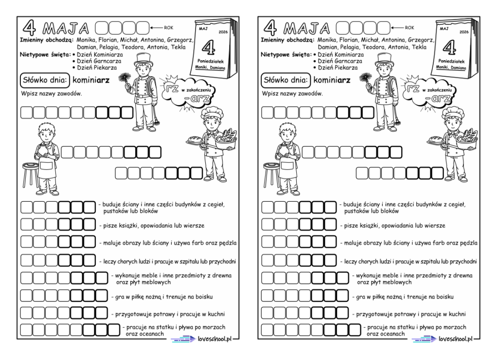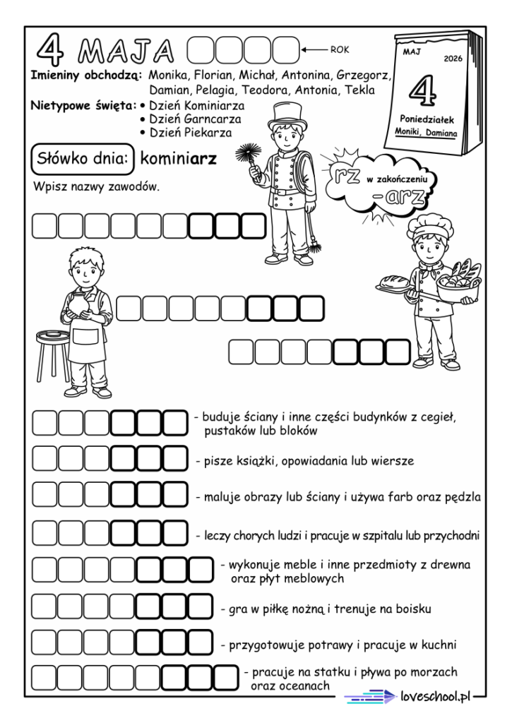 Maj Zostaw komentarz / język polski / Karolina Marszałek / 2026-04-02 Wybierz kartę pracy: 4 maj Pobierz PDF Pobierz PDF Polecamy również: Lapbook „H” Lapbook „Ż” Brzydkie Kaczątko Dziewczynka z zapałkami Królowa Śniegu Zimowy pakiet edukacyjny Maj Dowiedz się więcej »